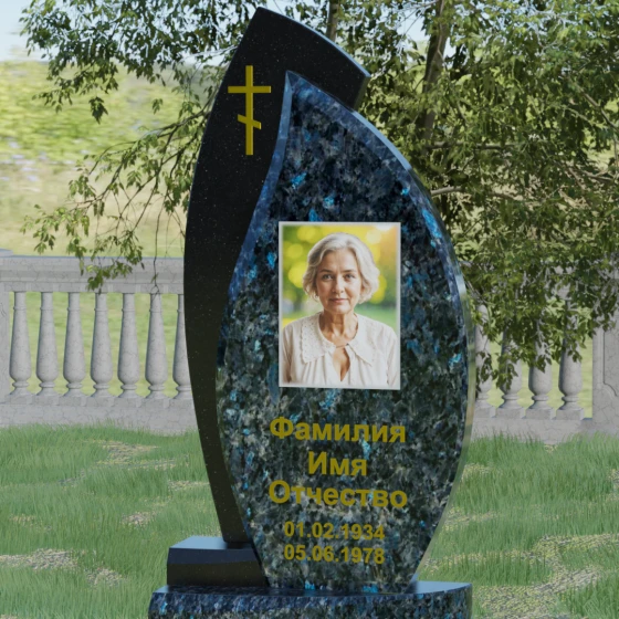 Основой художественного замысла выступает эффектная асимметрия и игра контрастных фактур. Центральная часть надгробия, предназначенная для размещения портрета и памятных надписей, выполнена в форме изящного лепестка или капли из глубокого черного камня. Ее плавные, текучие линии символизируют бесконечность бытия и чистоту души. Оправа, охватывающая центральный элемент с левой стороны, имеет более строгую, динамичную геометрию с выраженным острым углом в верхней части, что создает визуальный эффект защищенности и опоры. Особое внимание уделено деталям: на левом «крыле» композиции лаконично расположился восьмиконечный православный крест, выполненный в технике глубокой гравировки с последующим золочением. Это придает всей конструкции духовную завершенность и благородство.