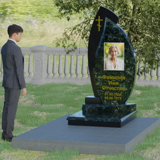 Кому подойдет: Данная модель является универсальным и в то же время глубоко индивидуальным решением. Благодаря мягким изгибам центральной части, она идеально подходит для оформления женских захоронений, воплощая нежность и материнскую любовь. В то же время строгая внешняя рама и возможность исполнения в темных, маскулинных тонах (например, в черном Габбро или зеленом граните Балтик грин) делают этот гранитный монумент достойным выбором для мужчины — отца, мужа или брата. Это памятник для тех, кто ценит современный стиль, надежность и хочет выделить место памяти среди типовых решений за счет уникальной формы и премиального сочетания материалов.