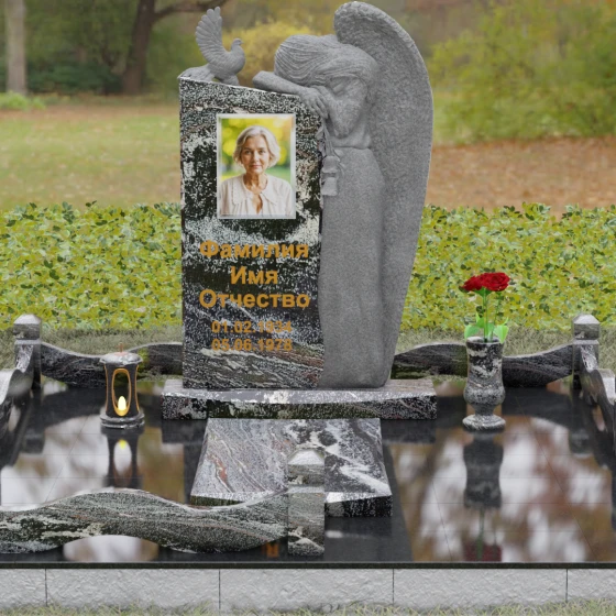 Представленный мемориальный ансамбль (Артикул 129) — это не просто памятный знак, а глубокое архитектурное высказывание, в котором застывшая в камне скорбь обретает форму высокого искусства. Величественная стела доминирует в композиции, представляя собой сложный симбиоз строгой геометрии и филигранной художественной резьбы. Центральным элементом является объемная фигура скорбящего ангела, выполненная в технике глубокого барельефа. Мастерски переданная пластика крыльев с детальной проработкой каждого перышка создает ощущение мягкости, которая парадоксальным образом контрастирует с твердостью натурального камня. Склоненный лик ангела и тонкие складки его одеяний, выполненные в матовом срезе, эффектно выделяются на фоне зеркально полированной поверхности основной плиты. В руках небесного покровителя застыла роза — символ вечной любви, чьи лепестки проработаны с исключительным вниманием к объему и естественности линий.