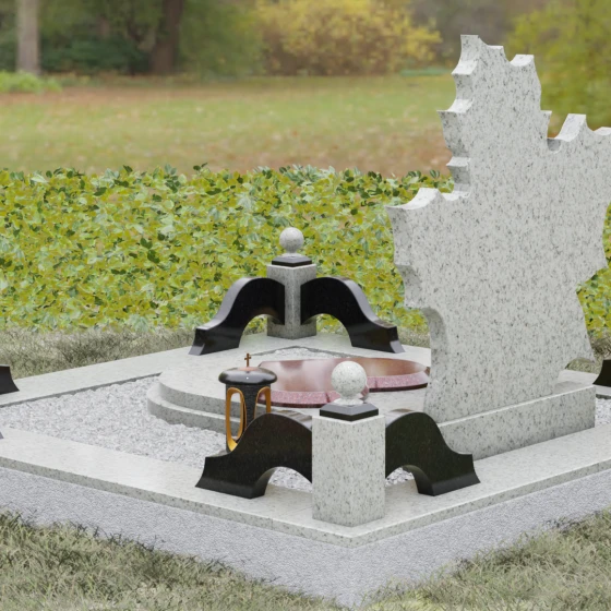 Завершенность ансамблю придают декоративные элементы: изящные каменные шары на столбиках ограждения, символизирующие целостность и бесконечность, а также точеная гранитная ваза, установленная у подножия. Ваза позволяет всегда держать живые цветы в достойном обрамлении. Каждый элемент этого комплекса — от резного листа до полированного цоколя — работает на создание единого пространства скорби и любви.
