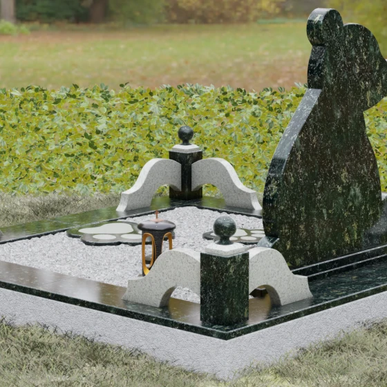 Для того чтобы мемориал максимально точно отражал характер и личность человека, мы предлагаем выполнение данной модели в 8 цветовых решениях. На выбор представлены 7 сортов элитного гранита (Гамбро-диабаз, Амфиболит, Балтик грин, Блю Перл, Дымовский, Лезниковский, Мансуровский) и белоснежный мрамор Тассо. Например, глубокий черный Габбро-диабаз подчеркнет строгость и монументальность, в то время как мерцающий Блю Перл или светлый Мансуровский гранит придадут композиции легкость и небесную чистоту. Комбинирование двух контрастных оттенков камня, как показано на образце, позволяет выделить художественные детали и создать эффектный визуальный объем.