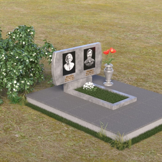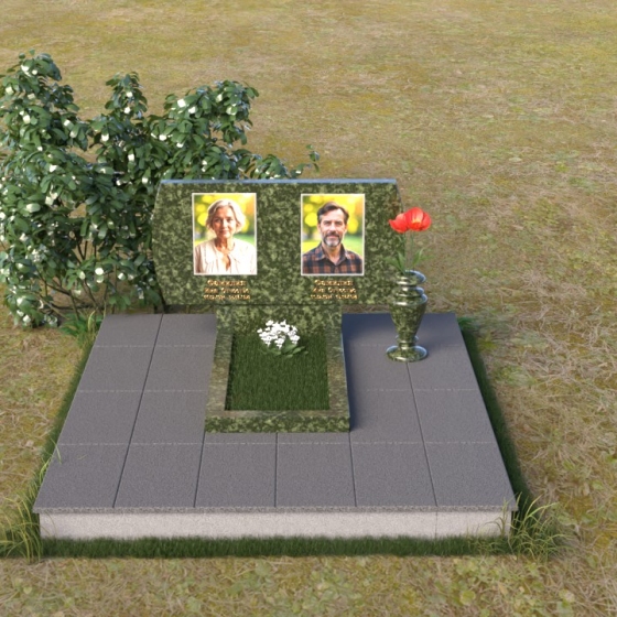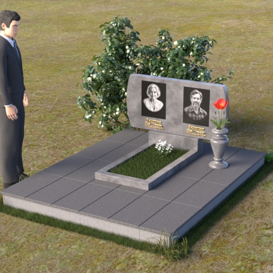 Композиция памятника строится на контрасте строгих геометрических форм и плавных линий, создавая гармоничный и запоминающийся образ. В верхней части возвышается стела из черного гранита, чья зеркальная полировка отражает небо и окружающий мир, словно напоминая о связи земного и небесного. Верхние углы стелы скруглены, смягчая строгость формы и придавая ей более мягкий, человечный облик. На стеле размещены портреты усопших, выполненные с высокой точностью и передающие их индивидуальность. Золотистые надписи имен и дат словно светятся на фоне черного камня, добавляя торжественности и значимости. У подножия стелы располагается горизонтальная плита, также выполненная из полированного черного гранита, создающая ощущение завершенности и устойчивости. Рядом – изящная ваза из того же материала, предназначенная для живых цветов, символа неувядающей памяти и любви.