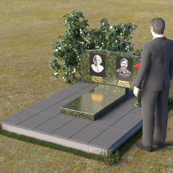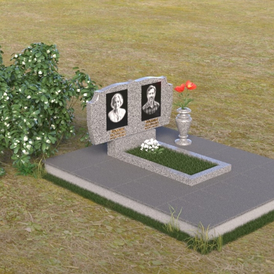 Композиция монумента строится на контрасте плавных линий и строгих геометрических форм. Верхняя часть, несущая на себе портреты усопших, имеет форму, напоминающую раскрытую книгу или свиток, где каждая страница хранит историю жизни. Края этого "свитка" искусно обработаны: верхняя грань словно оплавлена временем, приобретая мягкие, неровные очертания, а боковые стороны имеют более четкий, но все же сглаженный профиль. Фаска, идущая по периметру, придает верхней части визуальную легкость, отделяя ее от основания. Нижняя часть представляет собой прямоугольную плиту с зеркальной полировкой, отражающей небо и окружающий мир, создавая эффект бесконечности и связи с ушедшим. Она словно портал, соединяющий мир живых и мир мертвых, напоминая о непрерывности бытия. Боковины плиты имеют четкую геометрию, подчеркивая основательность и незыблемость памяти.