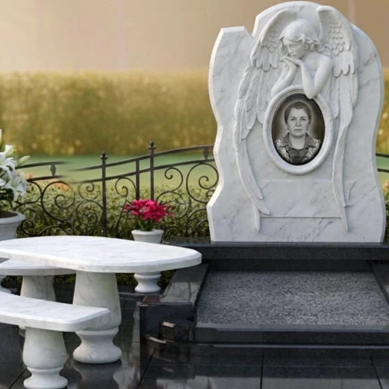 Форма стелы с ее арочным силуэтом и центральным резным изображением скорбящего ангела предоставляет широкие возможности для размещения портрета усопшего. Наиболее гармонично портрет будет смотреться в верхней части стелы, над фигурой ангела, или же в центральной части, если изображение ангела будет смещено вниз или выполнено в виде барельефа. Зеркальная полировка поверхности идеально подходит для высококачественной гравировки портрета и эпитафии, обеспечивая четкость линий и долговечность изображения. Благодаря гладкой поверхности камня, портрет будет выглядеть максимально выразительно, а отражающая способность полировки придаст ему особую глубину и объем. Выбор шрифта для эпитафии также играет важную роль: классические, строгие шрифты подчеркнут серьезность и торжественность момента, в то время как более изящные и каллиграфические могут добавить нотку индивидуальности. Этот мемориальный комплекс — это не просто камень, это архитектурное произведение, призванное сохранить светлую память о человеке и стать местом утешения для близких. Он станет вечным свидетельством любви и уважения, воплощенным в прочном и прекрасном материале.