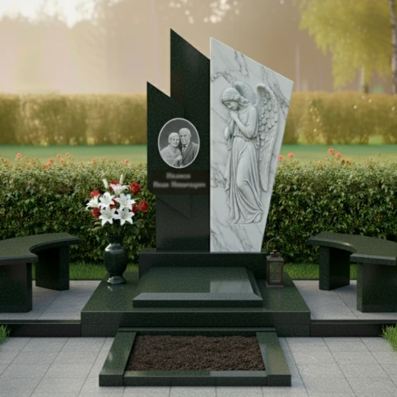 Правая часть стелы представляет собой светлую, матовую плиту, которая словно обнимает темный элемент, создавая динамичный и в то же время умиротворяющий образ. Поверхность этой плиты украшена глубокой, объемной резьбой в виде склоненного ангела с распростертыми крыльями. Каждая деталь резьбы – от складок одеяния до перьев на крыльях – выполнена с невероятной точностью и трепетом, передавая ощущение покоя и скорби. Матовая фактура камня на резном изображении ангела мягко рассеивает свет, придавая фигуре эфемерность и выразительность, в то время как зеркальная полировка темного гранита отражает окружающий мир, создавая глубокий контраст и игру света.