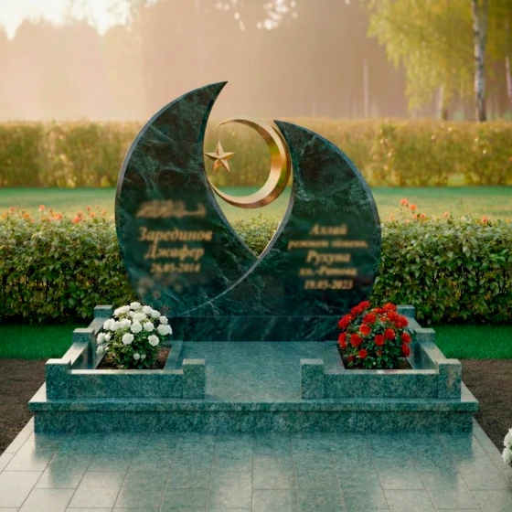 Модель ПН 157 представляет собой истинное произведение искусства, воплощенное в камне, призванное стать вечным символом памяти и уважения. Величественная стела, выполненная в глубоком черном цвете, мгновенно притягивает взгляд своей необычной, но гармоничной формой. Ее силуэт напоминает два полумесяца, обращенных друг к другу, создавая динамичную композицию, которая символизирует единство и бесконечность. В центре этой дуальности, словно небесное светило, парит золотистый полумесяц, в объятиях которого покоится изящная пятиконечная звезда. Этот центральный элемент выполнен с ювелирной точностью, его отполированная до зеркального блеска поверхность отражает свет, создавая ощущение невесомости и духовности. Грани стелы тщательно обработаны, демонстрируя безупречную гладкость и плавные переходы, которые подчеркивают естественную красоту камня. Зеркальная полировка черного гранита создает эффект глубокого космоса, в котором каждый луч света играет и преломляется, обещая сохранить свой первозданный блеск на столетия, неподвластный времени и стихиям.