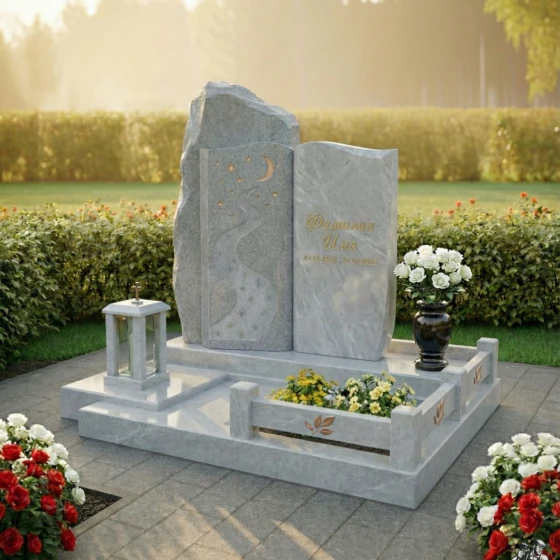 Модель ПН 196 представляет собой двухчастную композицию, где каждая стела обладает своим неповторимым характером. Левая стела, выполненная в виде необработанной скалы, символизирует вечность и незыблемость. Её фактурная поверхность, лишенная зеркальной полировки, создает ощущение первозданной мощи природы. На этой стеле, словно высеченная самой природой, изображена гравировка, стилизованная под ночное небо с извивающейся рекой звезд. Полумесяц и россыпь мерцающих звезд, выполненные с удивительной детализацией, создают эффект глубины и космического спокойствия, а светлая матовая фактура рисунка контрастирует с темным, почти черным полированным фоном, придавая изображению объем и выразительность. Звездная река, плавно уходящая вверх, символизирует путь души к небесам, а звезды напоминают о ярких моментах жизни.
