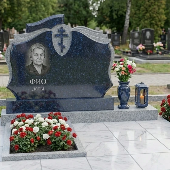 В основе композиции лежит монументальное надгробие, чья форма вызывает ассоциации с раскрытой книгой или древним свитком, символизируя жизненный путь, записанный в вечности. Плавные, волнообразные изгибы верхней части мемориальной плиты, напоминающие страницы, перелистываемые ветром времени, придают конструкции особую элегантность и динамику. В центре верхней части, на фоне глубокой черной полировки, вырезан лаконичный православный крест, выполненный в строгих, классических линиях, без излишних деталей, что подчеркивает его духовную значимость и чистоту веры. Крест, слегка утопленный в камень, создает игру света и тени, делая его объемным и выразительным. Ниже, в левой части надгробия, расположено искусно выполненное портретное изображение, обрамленное в овальную рамку, которая гармонично вписывается в общий контур. Под портретом предусмотрено место для имени и дат жизни, выгравированных четким и торжественным шрифтом, что завершает центральную часть композиции.