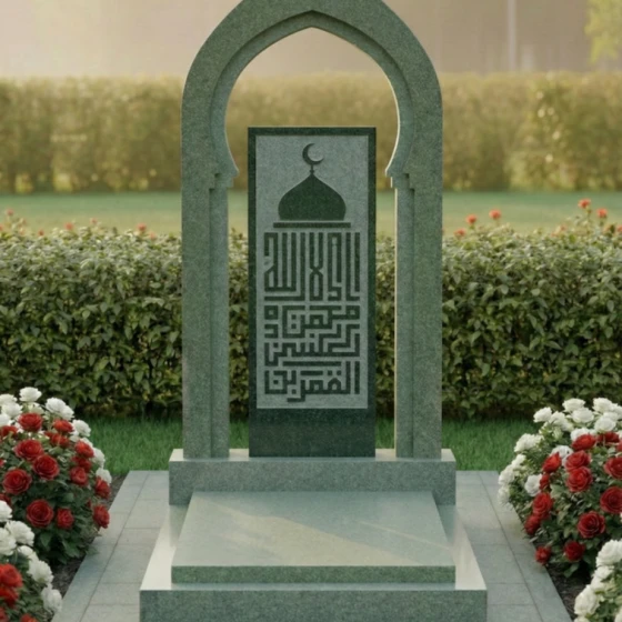 Представляем вашему вниманию модель памятника ПН 506 – это не просто надгробие из натурального камня, а истинное произведение искусства, призванное увековечить светлую память о близком человеке с глубоким почтением и достоинством. Каждая линия, каждый изгиб этого монумента пронизан смыслом и гармонией, создавая ощущение вечности и спокойствия. Центральная стела выполнена в форме изящной арки, напоминающей вход в священное место или портал в иной мир. Ее грани тщательно обработаны, создавая плавные переходы от полированных, зеркальных поверхностей к матовым, словно слегка припорошенным временем, срезам камня. Эта игра контрастов черного и серого гранита придает монументу невероятную глубину и объем, позволяя свету скользить по камню, подчеркивая его благородную текстуру. Внутри арки расположена прямоугольная вставка из светлого гранита, на которой выгравирована сложная каллиграфическая композиция, увенчанная полумесяцем и звездой – символами ислама. Эта гравировка выполнена с поразительной детализацией, где каждый элемент орнамента и каждая буква прорисованы с ювелирной точностью, создавая эффект кружевного узора, который кажется вырезанным из самого камня. Благодаря контрасту светлой гравировки на темном фоне, надпись читается легко и выразительно, притягивая взгляд и приглашая к размышлениям.