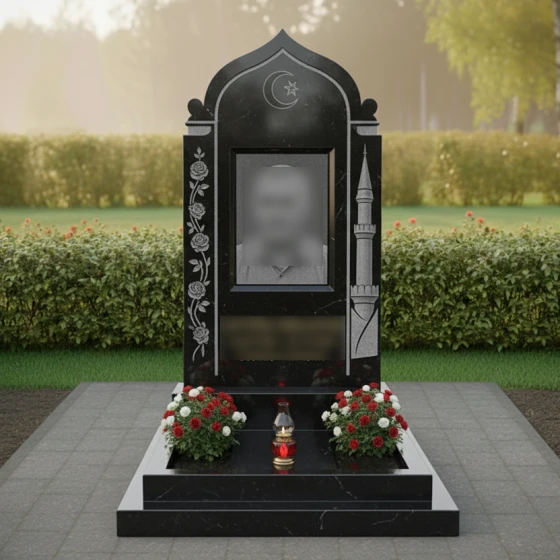 Особое внимание стоит уделить художественной резьбе, которая создает великолепный контраст с основной зеркальной поверхностью. На левой стороне фасада расположена вертикальная гирлянда из пяти распускающихся роз. Мастера детально проработали каждый лепесток: вы можете увидеть объемные изгибы бутонов и тонкие линии стеблей, которые словно оживают на холодном камне. Правая сторона украшена изображением стройного минарета — символа веры и стремления души ввысь. Венчают композицию искусно выгравированные полумесяц и звезда, выполненные в технике глубокой матовой гравировки, которая остается четкой даже спустя десятилетия под открытым небом.