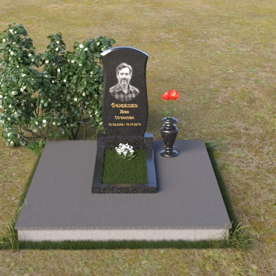 Данная модель предоставляет широкие возможности для индивидуального оформления. Портрет усопшего, выполненный методом гравировки, идеально вписывается в общую композицию, занимая центральное место на стеле. Золотистые буквы надписи, контрастируя с темным фоном полированного гранита, выглядят торжественно и выразительно. Мы рекомендуем выбирать фотографии высокого разрешения для достижения максимальной детализации и реалистичности портрета. Также возможно добавление дополнительных декоративных элементов, таких как эпитафии, религиозные символы или памятные даты. Небольшая подставка, выполненная в том же стиле, что и стела, гармонично дополняет композицию и может служить местом для возложения цветов. Элегантная ваза из черного гранита, расположенная рядом с надгробием, добавляет завершенность образу и позволяет сохранить свежесть цветов на длительное время.