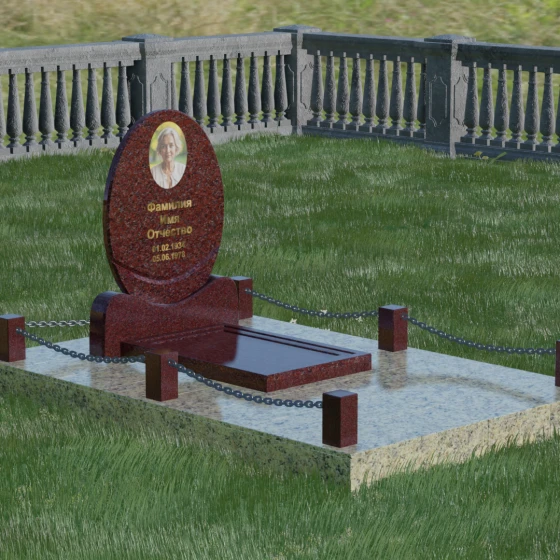 Центральным элементом стелы является глубокая ниша под овальный портрет (керамику или фото в стекле), которая идеально вписана в общую геометрию. Такое конструктивное решение защищает края портрета от сколов и придает образу завершенность. Ниже располагается пространство для эпитафии и дат, где каждая буква вырезается с идеальной четкостью. Благоустройство участка выполнено по высшему разряду: композиция дополняется массивной надгробной плитой, которая полностью закрывает цветник. Это не только придает объекту монументальный и законченный вид, но и значительно упрощает уход за местом памяти, избавляя от необходимости борьбы с сорняками. Периметр участка обрамляет строгий каменный цоколь, состоящий из полированных столбиков и соединительных элементов, которые могут быть дополнены декоративными цепями, создавая камерное и защищенное пространство.