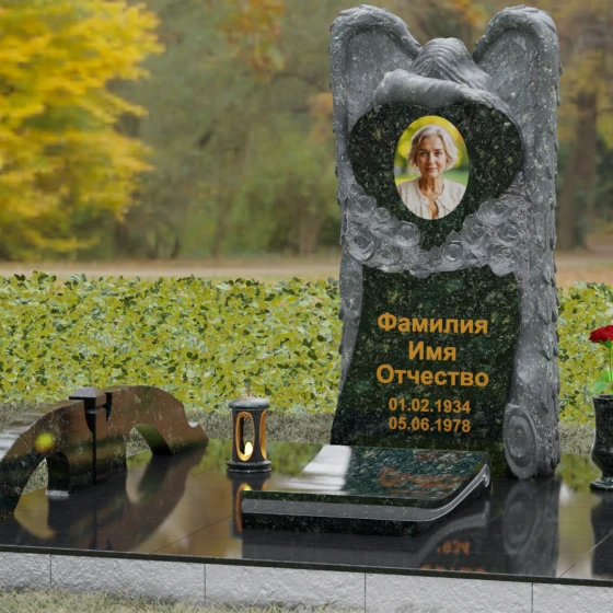 Этот проект выходит за рамки стандартного оформления захоронения. Монумент установлен на массивный гранитный цоколь с фактурной облицовкой по периметру, что обеспечивает конструкции исключительную устойчивость и защиту от воздействия почвы. Вместо открытого цветника здесь используется сплошная надгробная плита со скошенными гранями, что не только придает объекту законченный вид в стиле европейского модерна, но и существенно упрощает уход за участком. По краям композиции расположены декоративные гранитные элементы: изящная ваза для живых цветов и закрытая лампада (ритуальный фонарь), внутри которой может теплиться огонь памяти. Сложное ограждение в виде невысоких каменных арок на столбиках визуально очерчивает границы мемориала, превращая его в уединенное место для тихой беседы с ушедшим близким человеком.