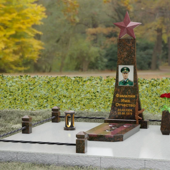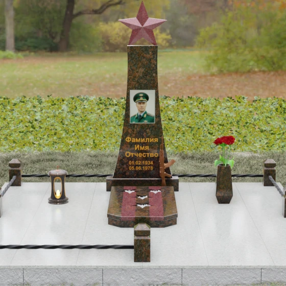 Мемориальный комплекс под артикулом 190 — это воплощение мужества, дисциплины и вечной памяти о человеке, чья жизнь была неразрывно связана с воинским долгом. Центральное место в композиции занимает высокая вертикальная стела, имеющая строгую, сужающуюся кверху геометрию. Такая форма выбрана неслучайно: она создает мощную визуальную вертикаль, направляющую взгляд зрителя ввысь, символизируя духовное восхождение и бессмертие подвига. Венчает монумент объемная пятиконечная звезда насыщенного красного цвета — символ чести и принадлежности к офицерскому корпусу. Одной из самых значимых и уникальных деталей данной модели является реалистично выполненная объемная фигура автомата Калашникова, прислоненного к боковой грани стелы. Этот элемент резьбы выполнен с безупречной точностью, подчеркивая профессиональный путь усопшего. Надгробие из натурального камня в таком исполнении выглядит величественно и бескомпромиссно, заявляя о силе характера того, кому оно посвящено.