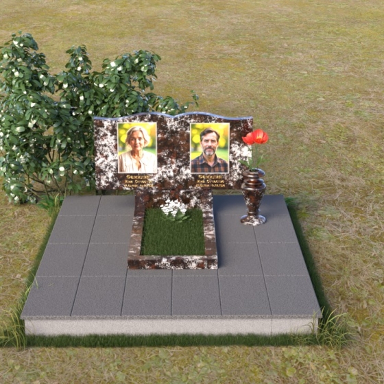 Этот гранитный монумент представляет собой вертикальную композицию, где основной акцент сделан на верхней части. Верхний край памятника имеет сложную, волнообразную форму, напоминающую плавные изгибы морской волны или нежные лепестки цветка. Этот элемент придает монументу легкость и изящество, смягчая строгость камня. Боковые грани монумента обработаны таким образом, чтобы подчеркнуть его вертикальность и стройность. Фаски по краям смягчают переход от лицевой поверхности к боковым, создавая ощущение завершенности и гармонии. Лицевая сторона монумента отполирована до зеркального блеска, отражая небо и окружающий мир, словно запечатлевая в себе вечность. На полированной поверхности выгравированы портреты усопших, выполненные с высокой степенью детализации. Под портретами расположены надписи с именами и датами жизни, выполненные строгим, элегантным шрифтом.