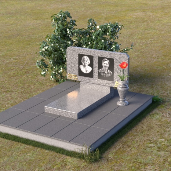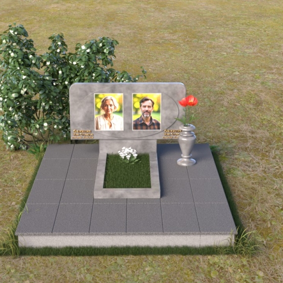 Этот ритуальное изделие – воплощение сдержанной элегантности и глубокого уважения. Прямоугольная стела с мягко скругленными углами создает ощущение завершенности и покоя. Верхняя часть памятника, словно рамка для воспоминаний, украшена выгравированными портретами. Полированная поверхность камня, подобно зеркалу, отражает свет, создавая игру бликов и теней, что придает глубину и объем изображениям. Горизонтальная плита под портретами добавляет композиции устойчивости и визуально расширяет пространство. Все элементы памятника объединены лаконичным дизайном, который говорит о достоинстве и вечной памяти.