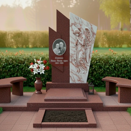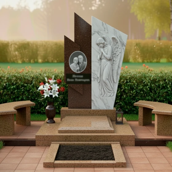 Правая часть стелы представляет собой светлую, матовую плиту, которая словно обнимает темный элемент, создавая динамичный и в то же время умиротворяющий образ. Поверхность этой плиты украшена глубокой, объемной резьбой в виде склоненного ангела с распростертыми крыльями. Каждая деталь резьбы – от складок одеяния до перьев на крыльях – выполнена с невероятной точностью и трепетом, передавая ощущение покоя и скорби. Матовая фактура камня на резном изображении ангела мягко рассеивает свет, придавая фигуре эфемерность и выразительность, в то время как зеркальная полировка темного гранита отражает окружающий мир, создавая глубокий контраст и игру света.