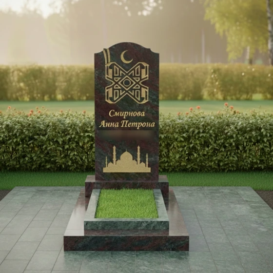 Данная мемориальная композиция под артикулом 722 представляет собой образец высокого художественного мастерства, где каждая линия пропитана уважением к традициям и духовности. Центральная стела выполнена в классической вертикальной форме с изящным навершием, напоминающим очертания купола мечети или арку священных врат. Плавный изгиб верхней грани придает монументу завершенность и гармонию, смягчая строгость натурального камня. Безупречная зеркальная полировка лицевой стороны создает глубокий, почти мистический блеск, на фоне которого особенно эффектно смотрятся элементы художественной резьбы.