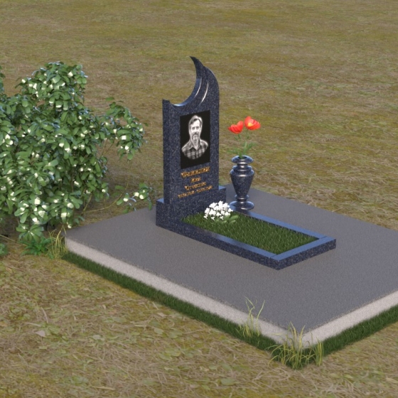 Этот гранитный монумент притягивает взгляд своей необычной формой. Основной элемент – вертикальная плита, увенчанная плавной, асимметричной дугой, напоминающей полумесяц. Её левая сторона чуть выше правой, что создает ощущение динамики и незавершенности, словно оборвавшейся жизни. Поверхность лицевой стороны отполирована до зеркального блеска, отражая небо и окружающий пейзаж, создавая иллюзию глубины и пространства. На полированной поверхности выгравирован портрет усопшего, надпись с именем и датами жизни. Нижняя часть монумента, сопрягаясь с горизонтальной плитой, образует единый ансамбль. Переход между вертикальной и горизонтальной плоскостями подчеркнут небольшой ступенькой, добавляющей конструкции объема. Горизонтальная плита, в свою очередь, также отполирована до блеска, отражая свет и усиливая эффект монументальности. Фаски на гранях плиты аккуратно обработаны, что придает памятнику завершенный и элегантный вид. Сбоку от монумента расположена небольшая гранитная ваза, предназначенная для живых цветов, которые станут символом вечной памяти и любви.